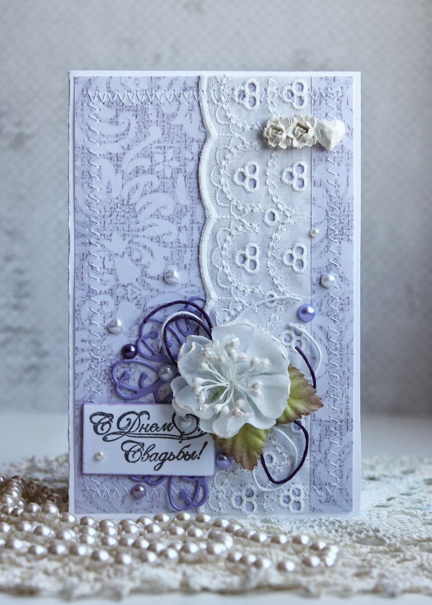 Для основной надписи «В день свадьбы» используйте штамп или готовый чипборд. Шрифт текста должен быть тонким и элегантным. Идеально, если открытка будет гармонировать с платьем невесты, повторяя кружева или элементы узора.